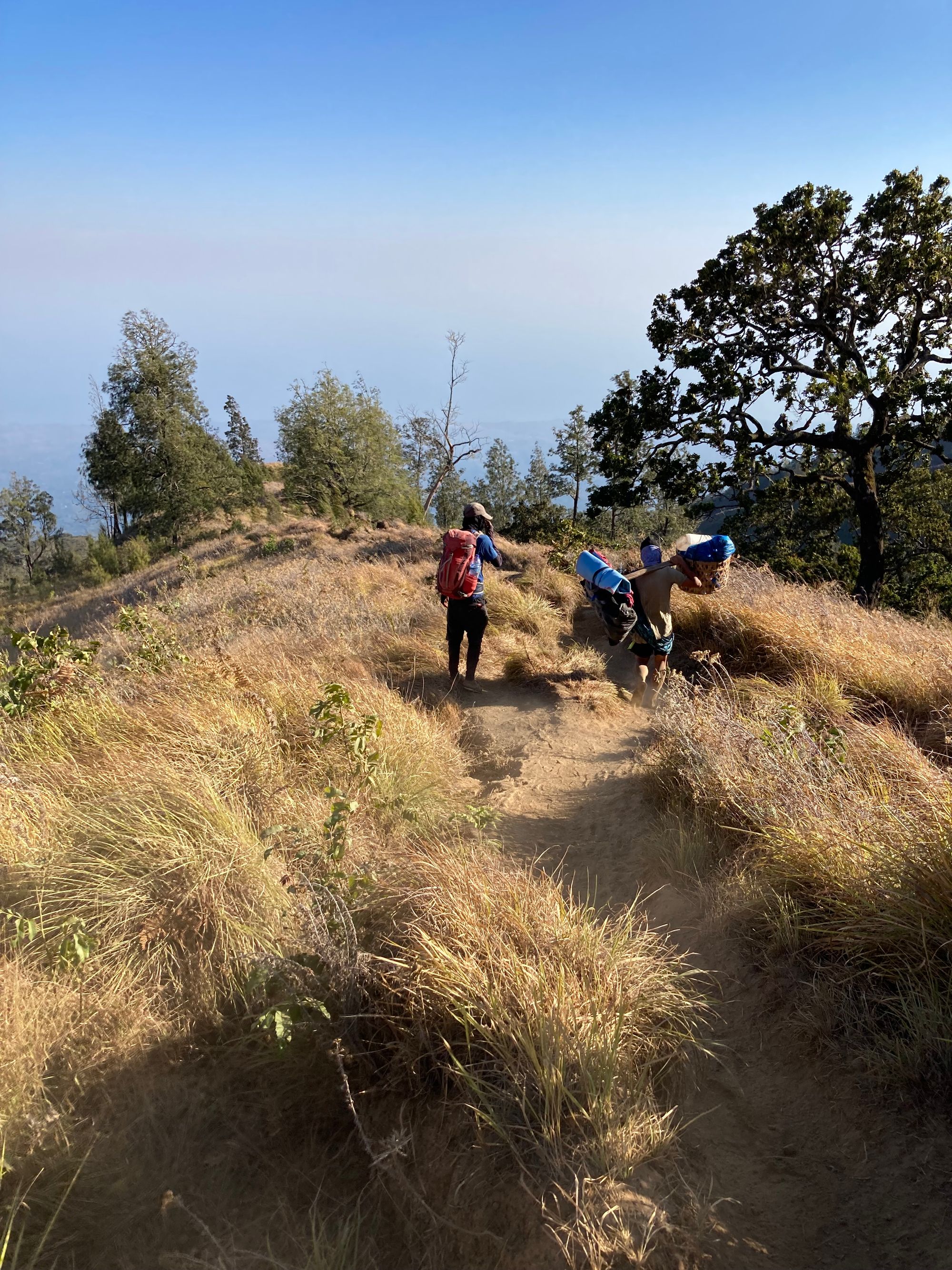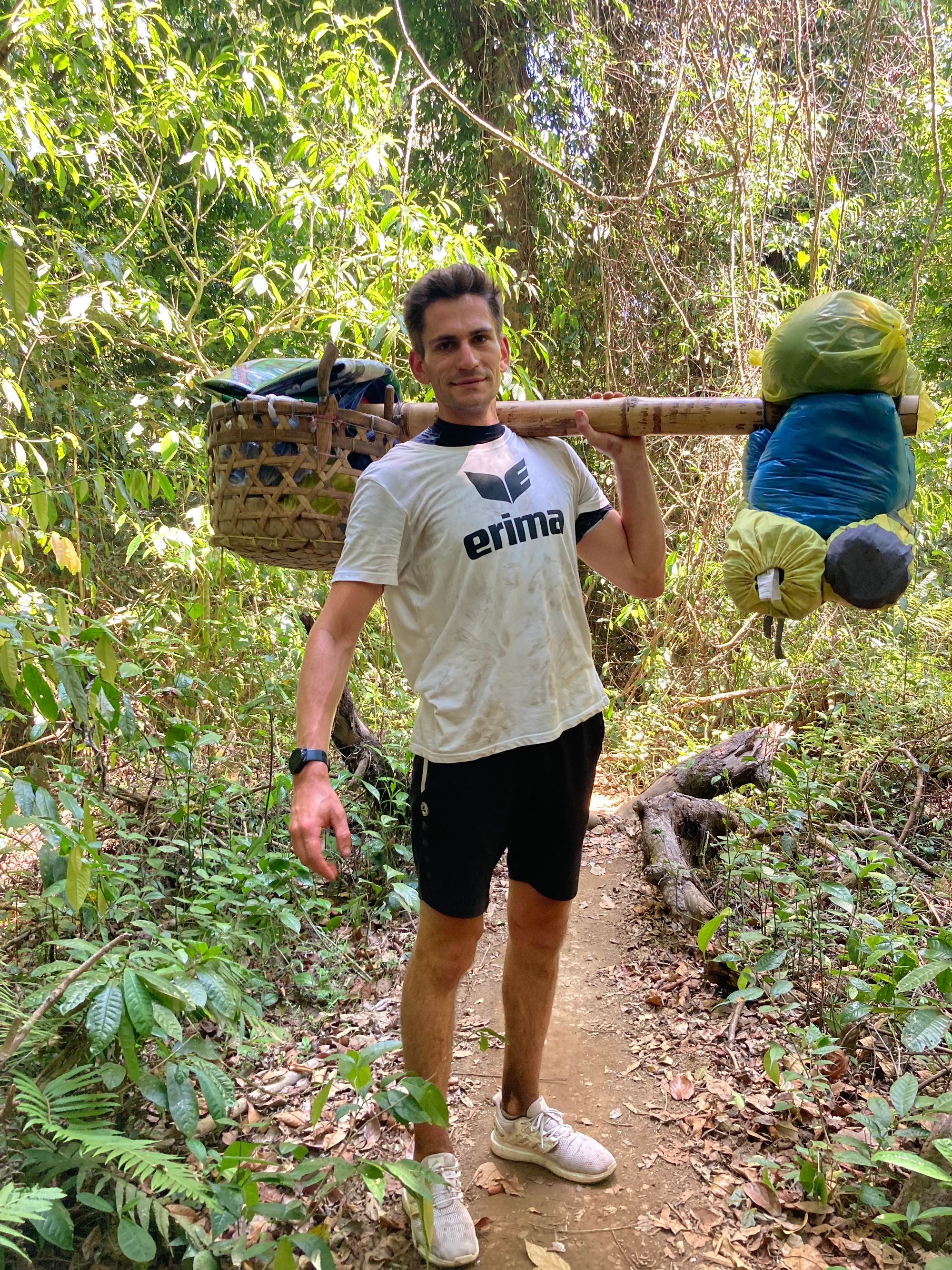 Die beiden Körbe wiegen nur noch 15 kg am letzten Tag, was immer noch genug ist. Es ist heiß und die Luftfeuchtigkeit ist brechend hoch. Ich schwitze am ganzem Körper und die Bambusstange drückt auf meine Schulter. Nach 20 Minuten erreichen wir einen kleine Lichtung und zwei Dutzend Träger schauen mich unglaubwürdig an. Ich drinke etwas und dann geht es weiter. Den ganzen Tag schmerzen meine Oberschenkel und ich merke, wie jeder Schritt mehr weh tut. Nach einer gefühlten Ewigkeit kommen wir an der letzten Position an. Ich setze die Körbe ab und atme durch.