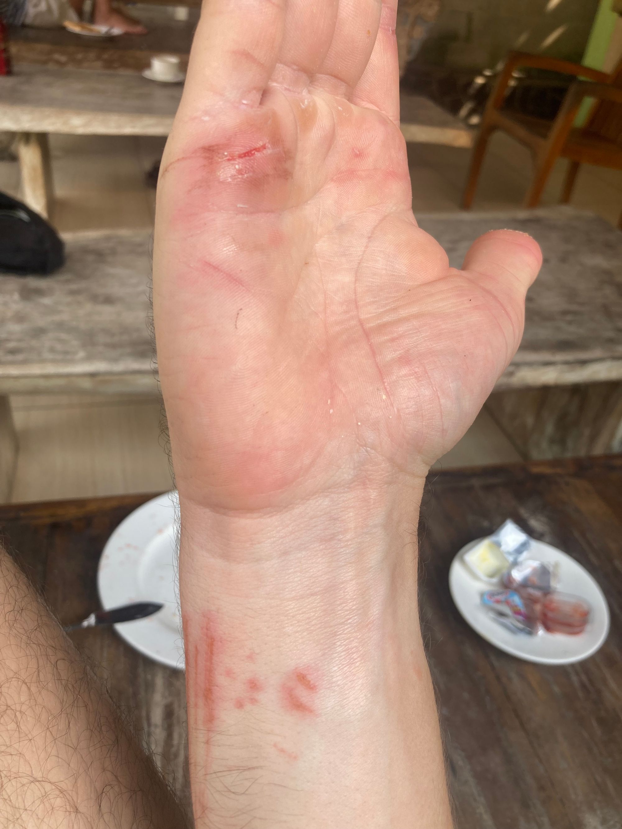 Heute morgen wurde ich um 5:45 Uhr zum surfen abgeholt. Hat super viel Spaß gemacht, leider surft man nicht über einen Sandstrand sondern über Korallen. Dementsprechend blieb der eine oder andere Kratzer nicht aus...